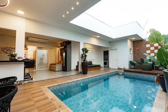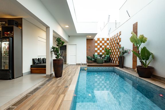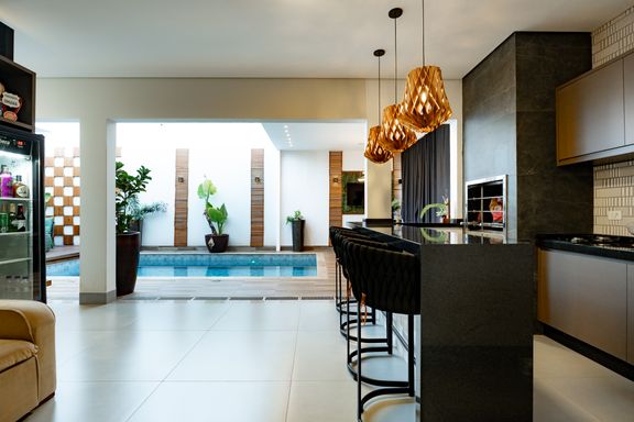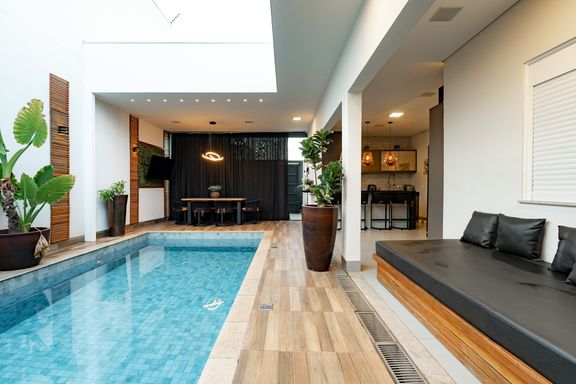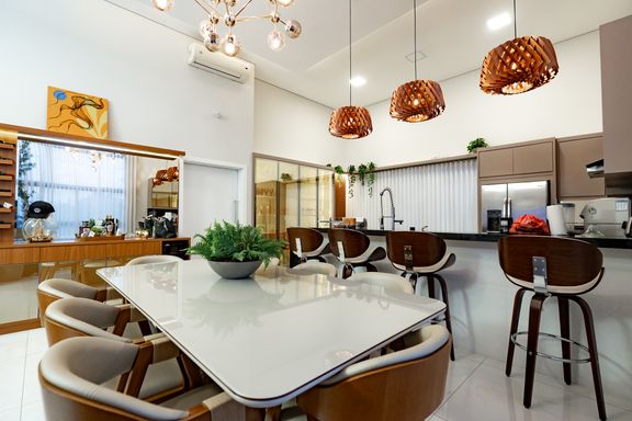 É composta por 3 suítes, sala 2 ambientes, , lavabo, cozinha integrada, área gourmet, bwc externo, área de serviço com estendal, piscina aquecida, jardins com paisagismo, acesso lateral, 3 vagas de garagem.