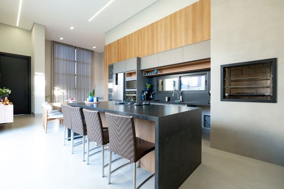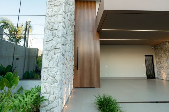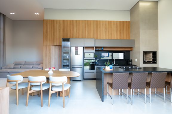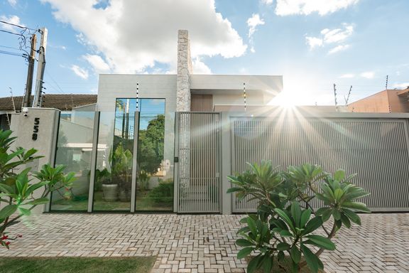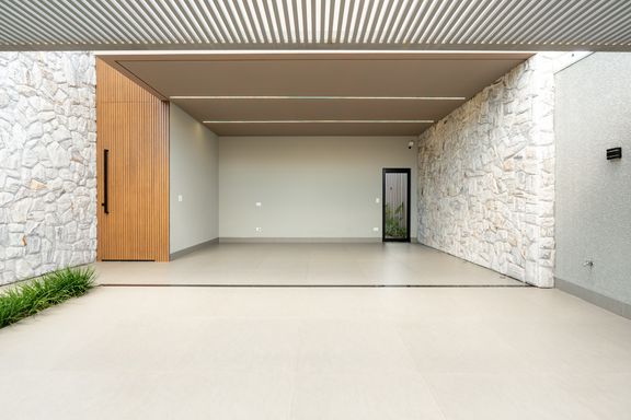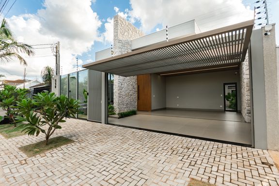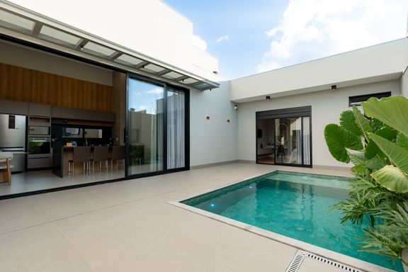 A sala e a cozinha são integradas, criando um ambiente moderno e funcional. A área externa dispõe de uma piscina ampla, perfeita para momentos de lazer. A garagem é paralela e comporta 2 carros, e a fachada apresenta um design moderno.