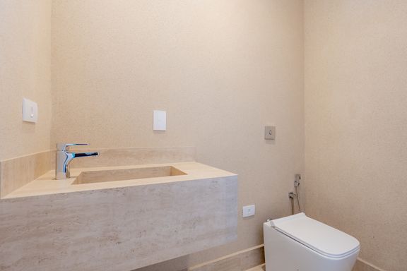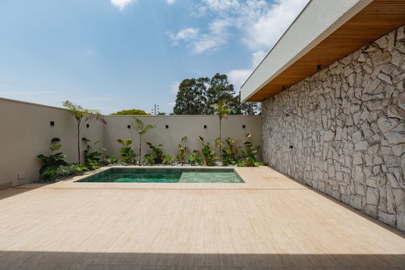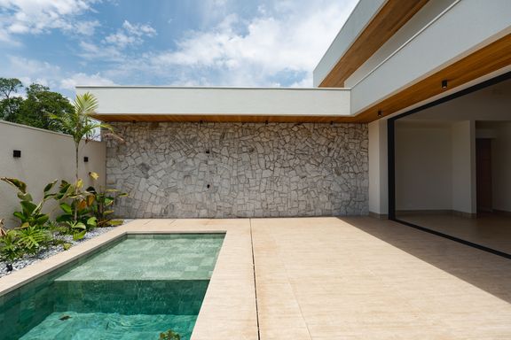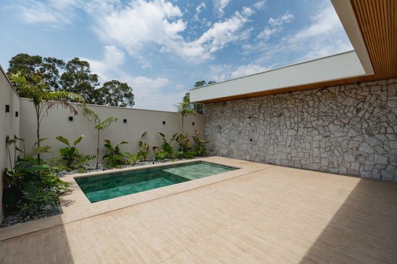 Lavabo interno e externo, despensa e lavanderia, 2 vagas de garagem cobertas e 2 vagas descobertas, totalizando 4 vagas. Piscina, acabamentos de alto padrão com detalhes em pedra natural, madeira e concreto aparente, com ampla iluminação natural.