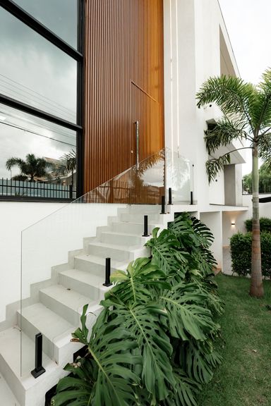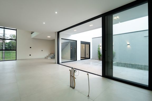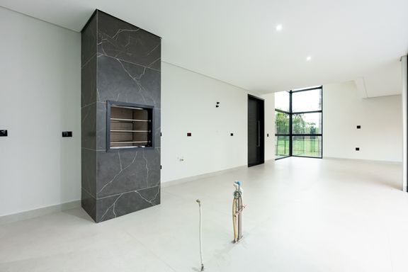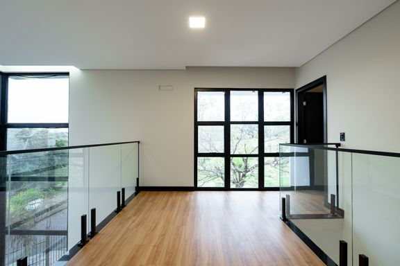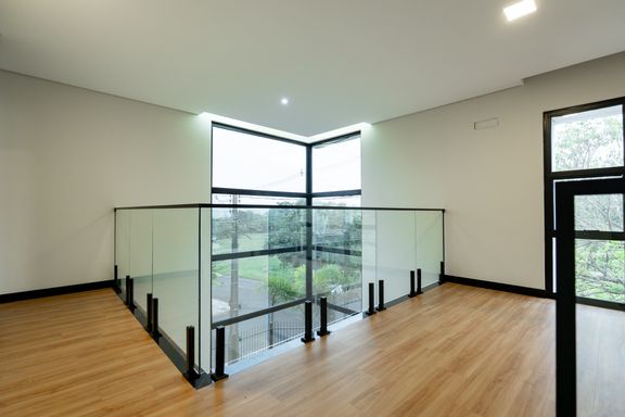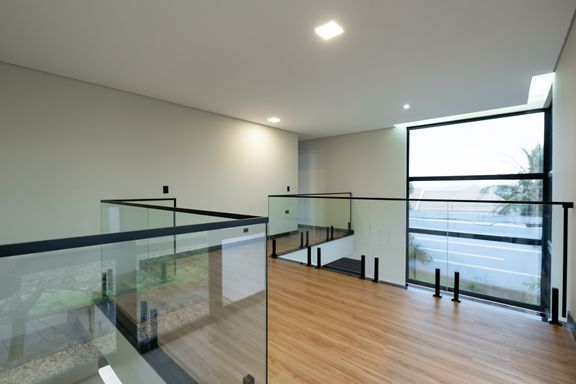 No piso superior, a casa conta com 3 suítes, sendo uma com closet e 2 com sacada. No piso inferior, há mais 1 suíte que pode ser utilizada como escritório. Os ambientes de cozinha e área gourmet são integrados, criando um espaço amplo e funcional. Há também um lavabo que atende essa área e a piscina.