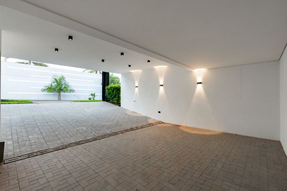 A área externa inclui piscina com hidromassagem e um espaço de apoio com depósito. A casa já possui sistema de câmeras e cerca elétrica instalados. A lavanderia é espaçosa, e a garagem comporta até 4 veículos, além de contar com 1 depósito adicional.