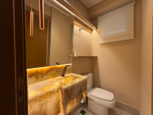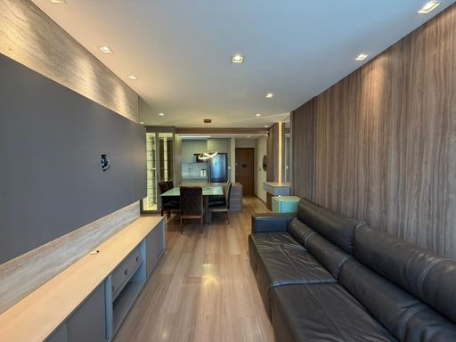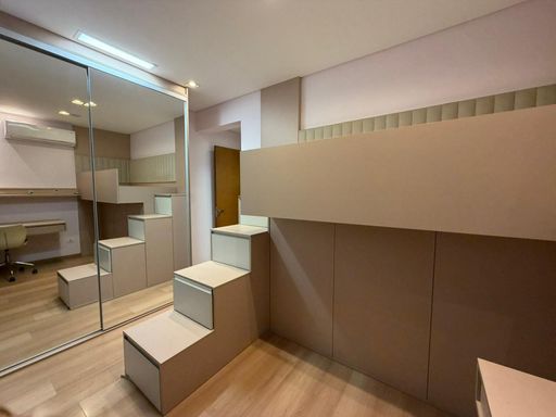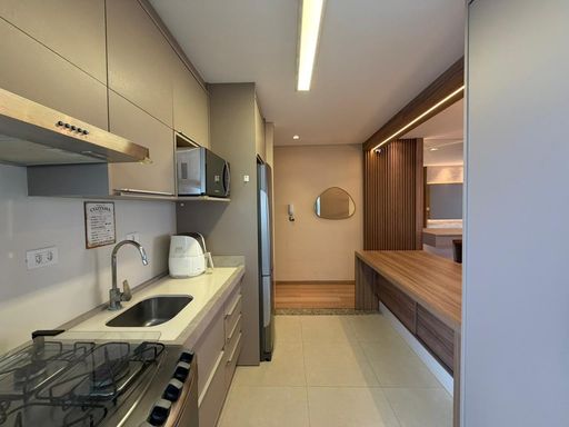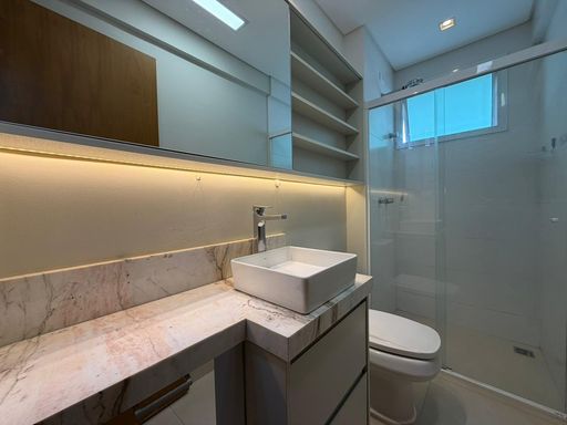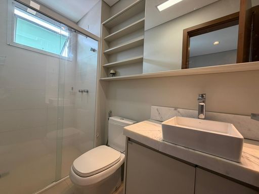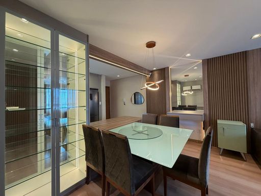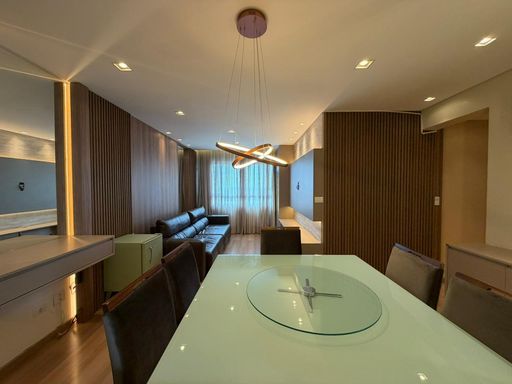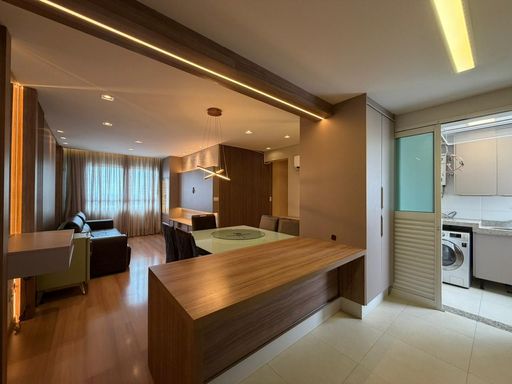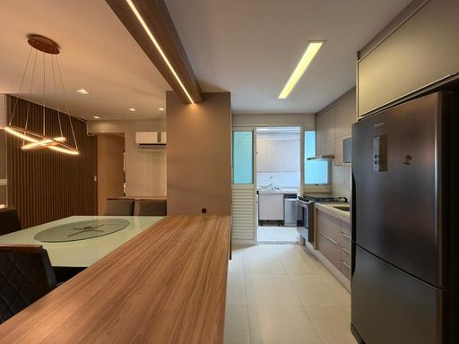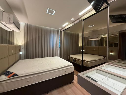 O apartamento fica no último andar (10º pavimento), 95m² privativos, 3 suítes, 100% mobiliado, 2 vagas de garagem paralelas.